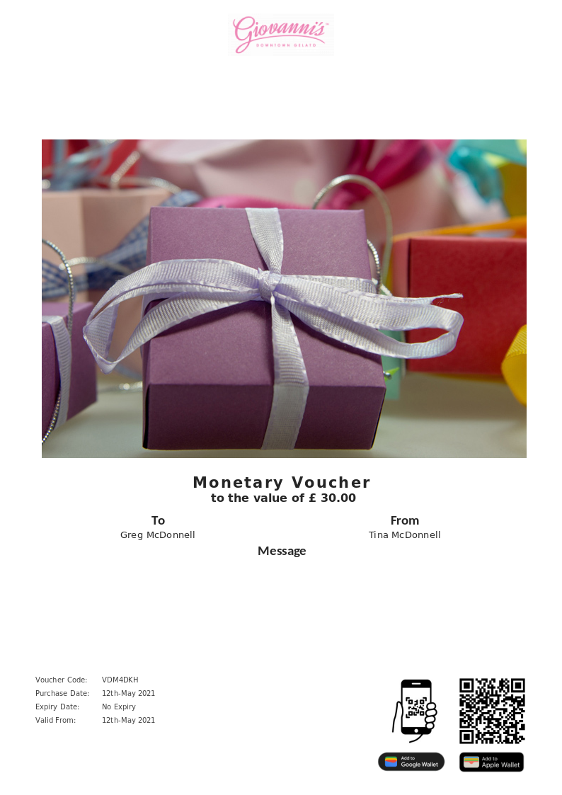 Giovanni's Downtown Gelato allows you to purchase instantly printable gift vouchers, special offers and tickets using the Voucher Connect platform.